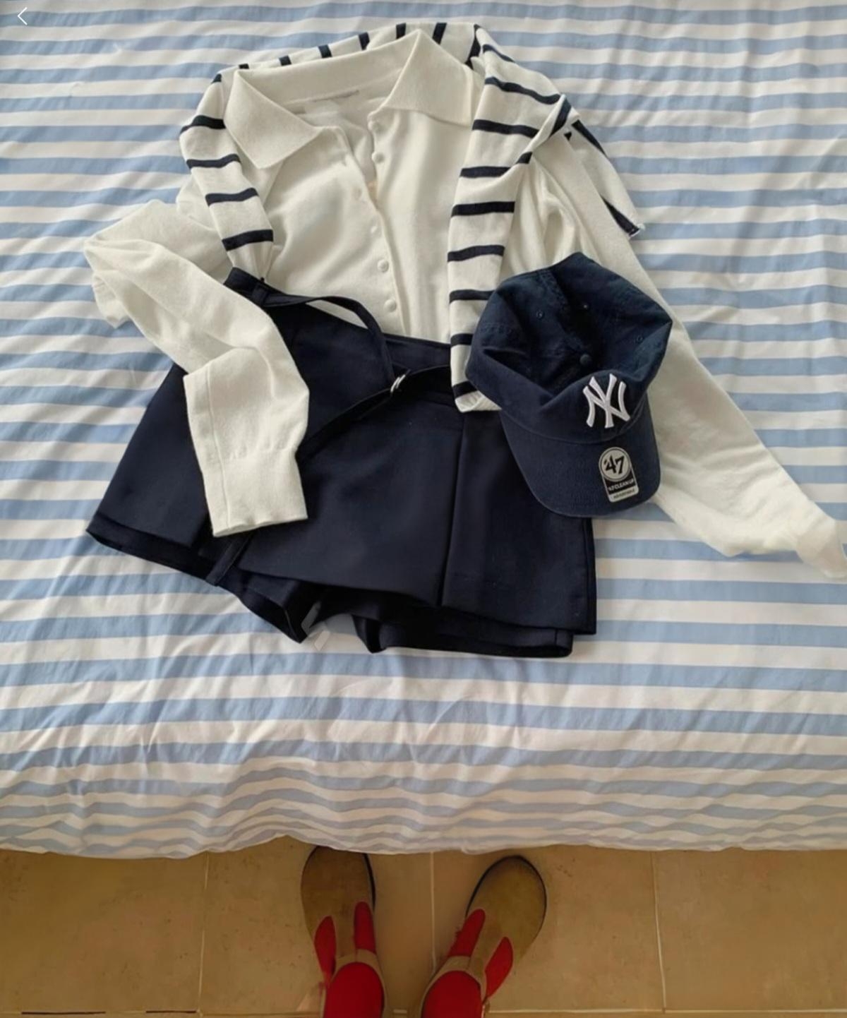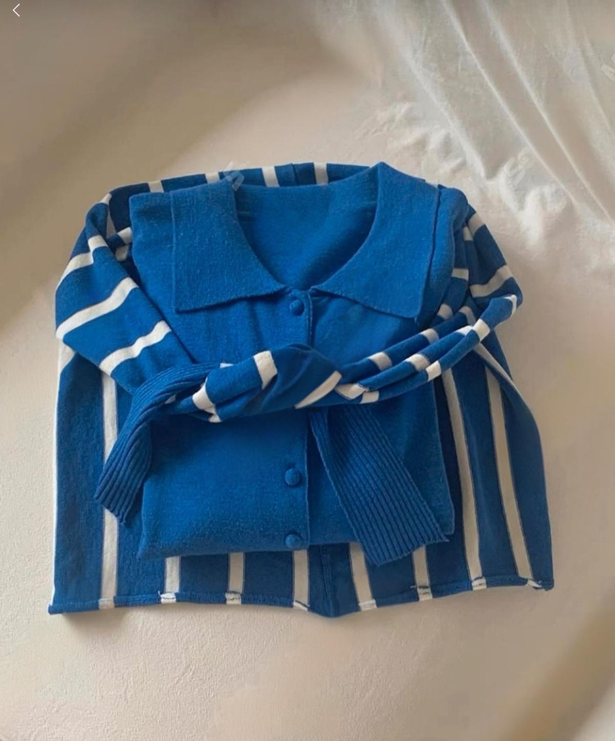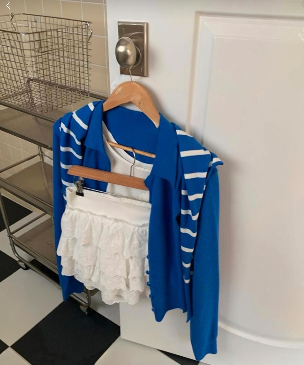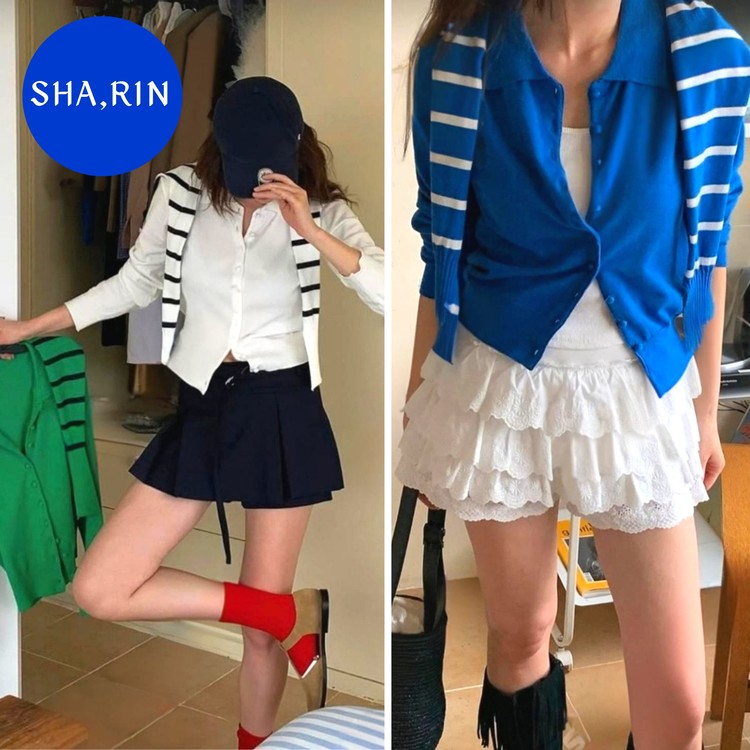 화이트,블루,그린의 이색적인 컬러로 포인트를 준 케이프 가디건 세트