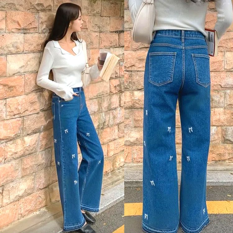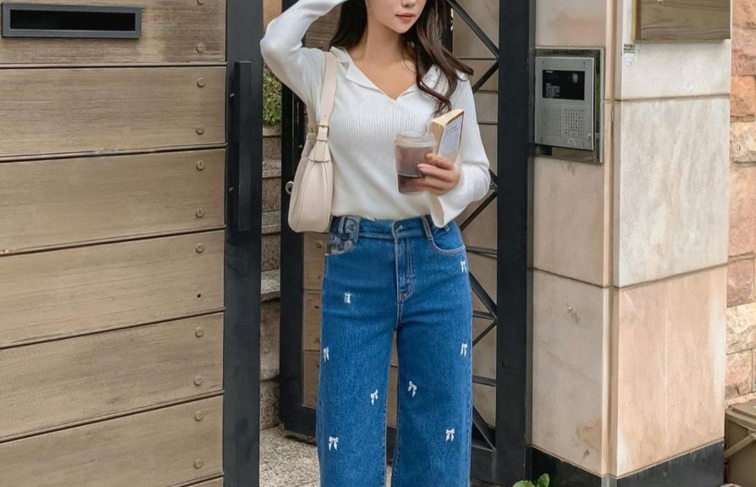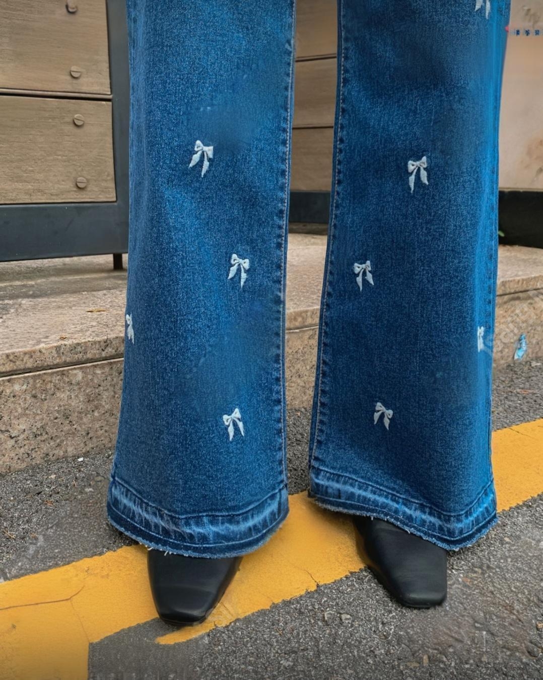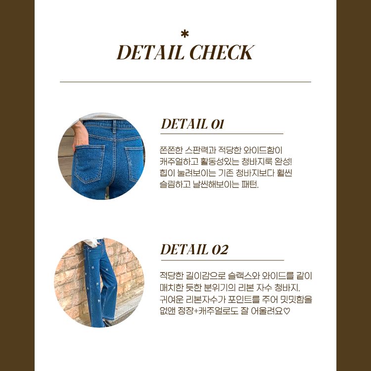 [씨엔엘]리본자수 핀턱 와이드 청바지